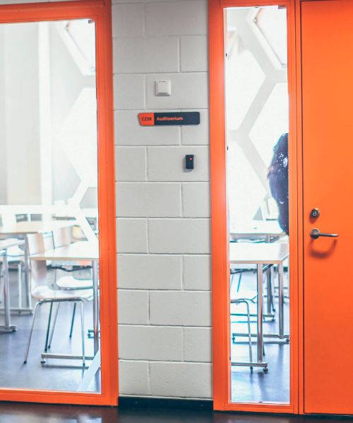 Vores profildøre fås 1-fløjet eller 2-fløjet i forskellige sikkerhedsklasser, der er afprøvet til sikring mod støj, skud eller indbrud og kan udstyres med med modullåse og intelligent adgangskontrol.