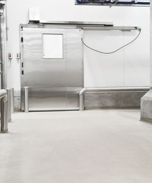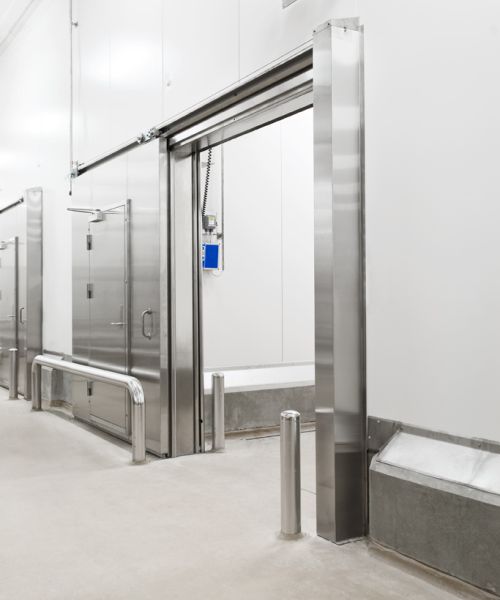 Vores skydeporte til køl overholder de strengeste krav inden for levnedsmiddelindustrien, hvor der er stor opmærksomhed på hygiejne, holdbarhed og funktionalitet. Vores produktprogram er yderst fleksibelt og giver jer mulighed for at vælge den konfiguration, der bedst matcher jeres behov, både i forhold til størrelse, betjening og isolering, og de kan naturligvis integreres med andre automatiske installationer, som eksempelvis transportbånd eller sluser. Af sikkerhedsmæssige årsager er alle porte forsynet med et kraftigt formbøjet håndtag i rustfrit stål på begge sider af døren, særligt udviklet til at gøre skydeporten nem at betjene. Automatisk betjente porte tilpasses naturligvis jeres behov, både i forhold til automatikkens betjening og åbne/lukkehastighed, så enhver risiko for at blive klemt er minimeret, og for at sikre, at dørene altid overholder de strengeste sikkerhedskrav.Skydeporte